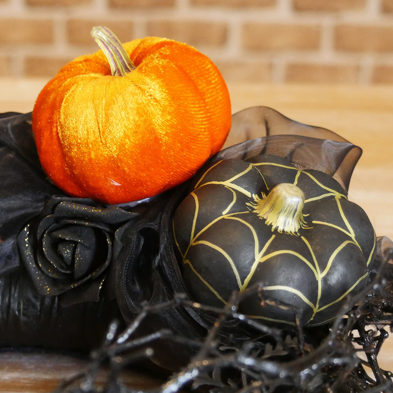 Ganz gleich, ob ihr es gruselig oder herbstlich bevorzugt, Halloween ist die perfekte Gelegenheit, um kreativ beides zu kombinieren. Besonders im Trend ist eine gespenstische Tischdekoration, die ein schaurig schönes Ambiente bringt und euer Gruseldinner gepflegt aufwertet. Bei diesem Kranz sind Naturmaterialien, schwarzes Seidenband, Samtkürbis, Spinnennetz und leichter Glitzer die Highlights und geben den eleganten Charme.