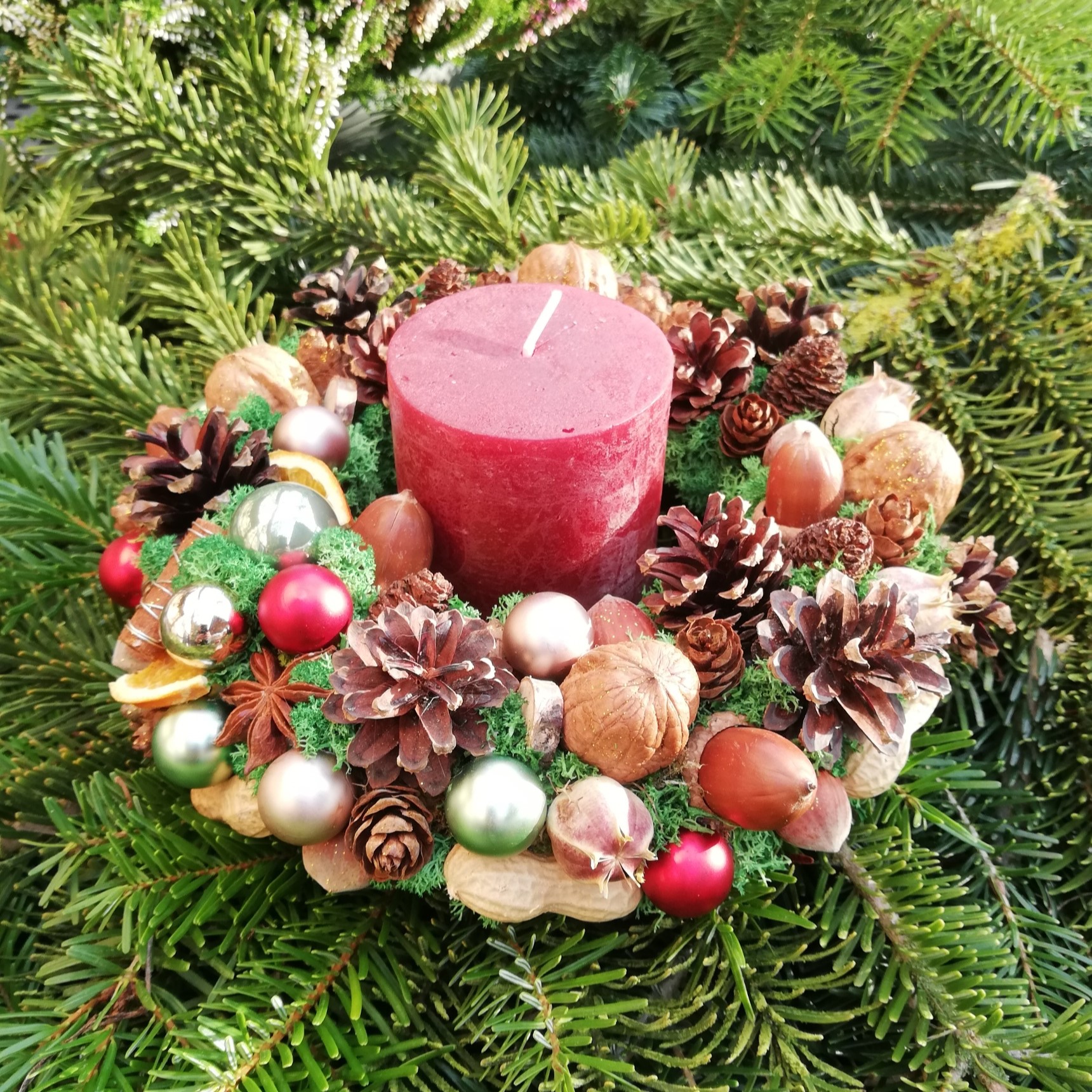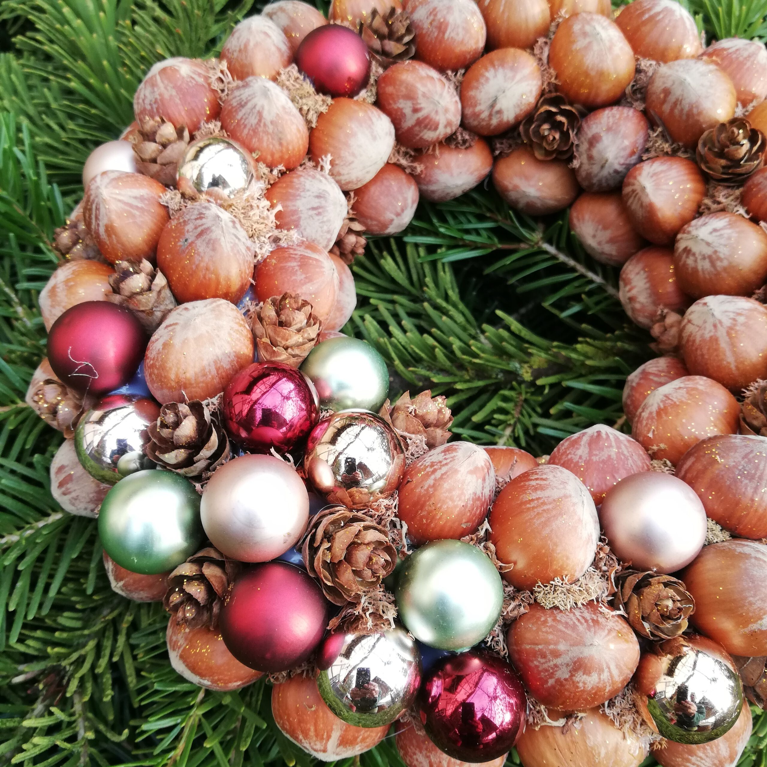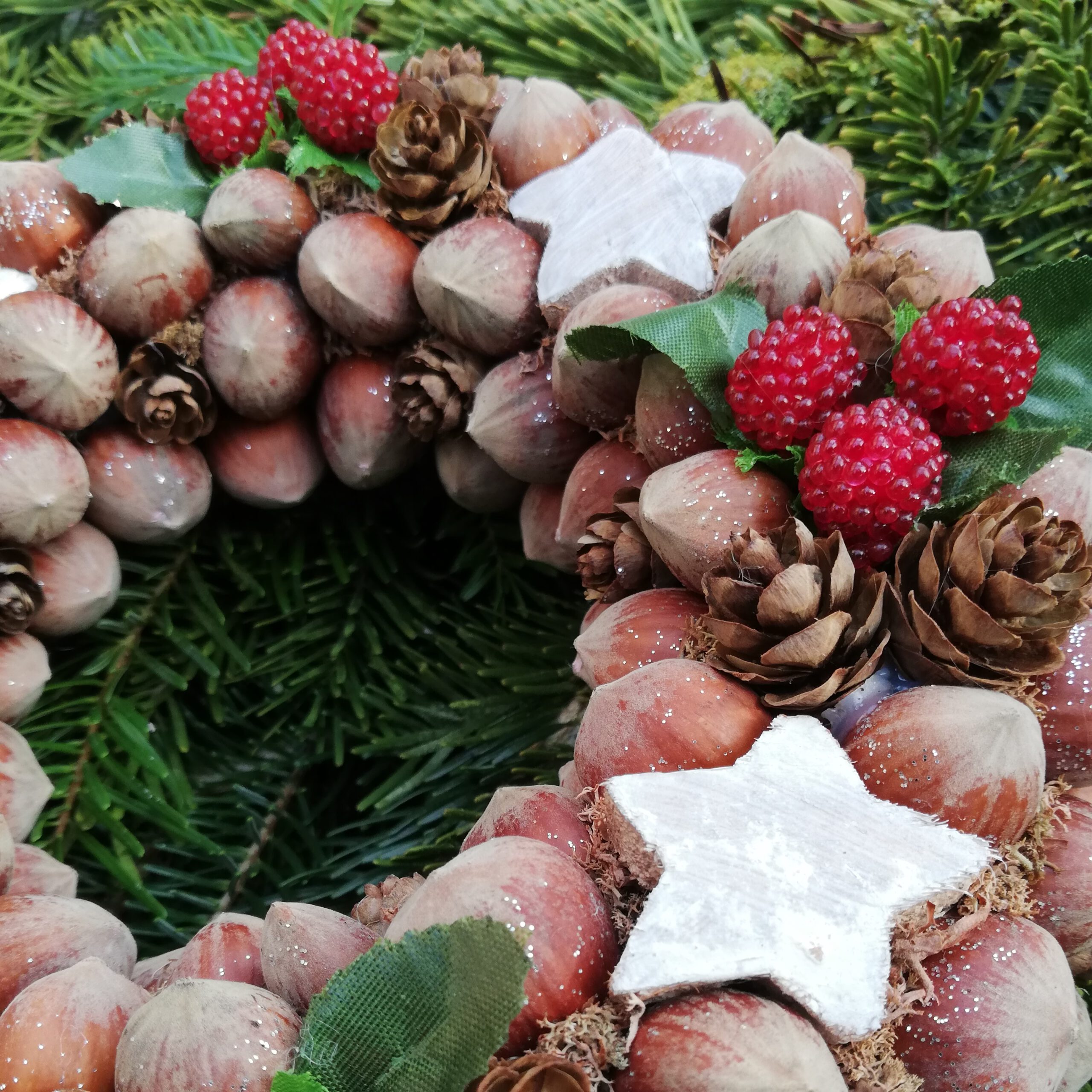 Haselnüsse und weihnachtliche Dekormaterialien schmücken diesen Kranz.